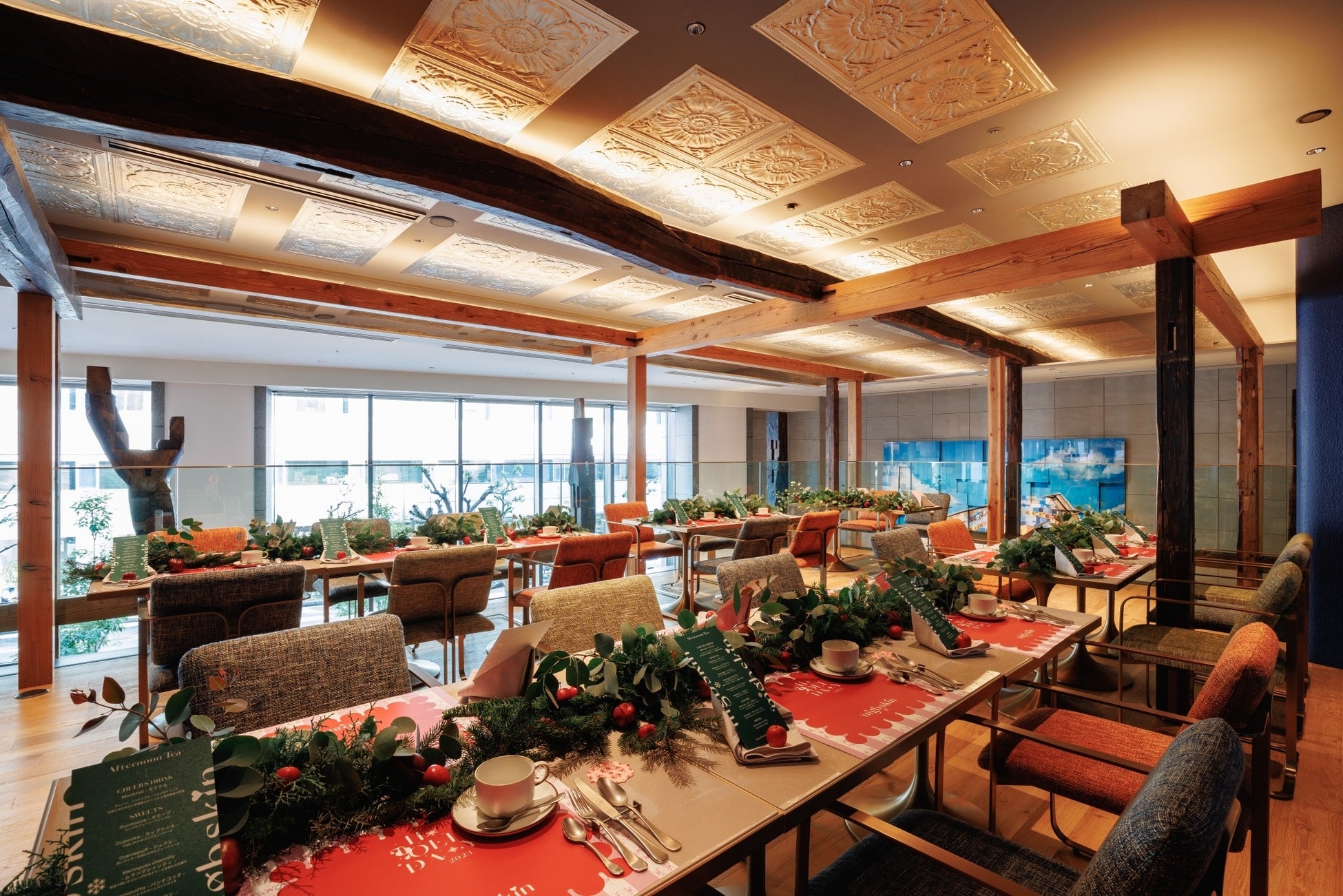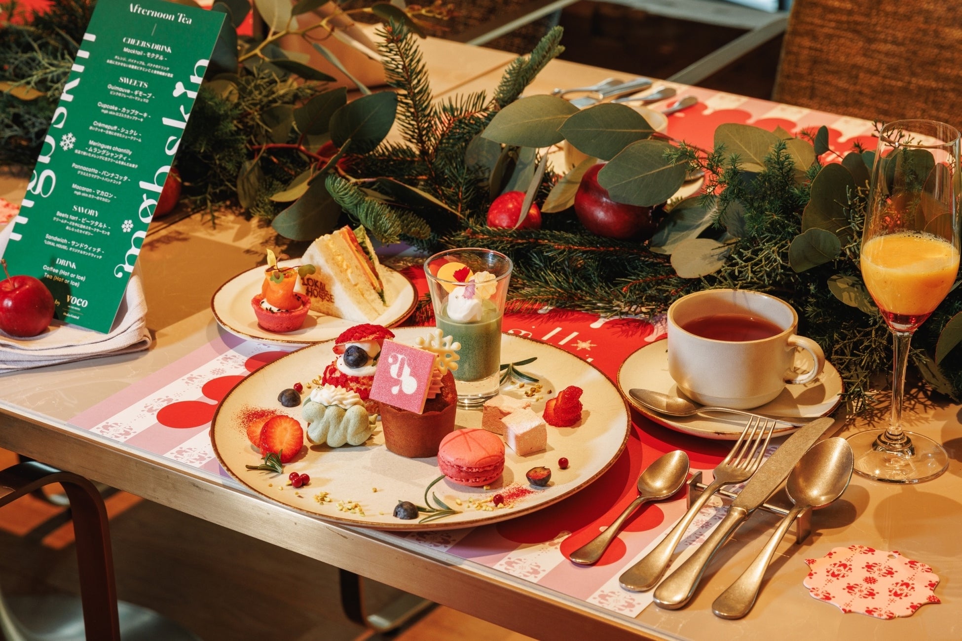 サンドイッチやデザートでオリジナルのアフタヌーンティーメニューをご用意。さらに店内の装飾をブランドカラーのピンクとホリデーシーズンらしいビビットな赤とグリーンを取り入れた空間づくりにこだわりました。
