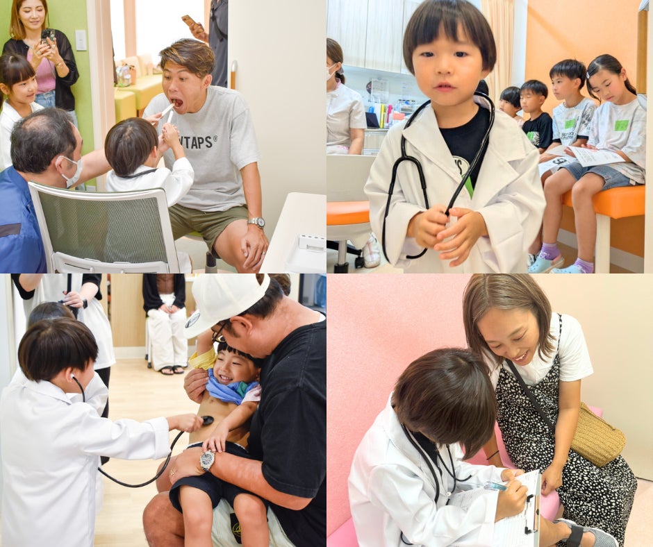 その後、子供たちは本物の白衣に袖を通し親御さんへの診療を体験した。今回の診療では諸症状の確認から、心音の確認、喉の検査などを疑似体験した。大人でもなかなか体験することのできない今回の体験は、子供たちにとっても濃密な時間となっただろう。将来スポーツ選手やそれぞれのビジョンを思い描くこども達。いつまでも健康で元気に過ごせ るよう日々できるケアや、健康への気遣いを改めて意識づけ出来る良い職業体験となった。
