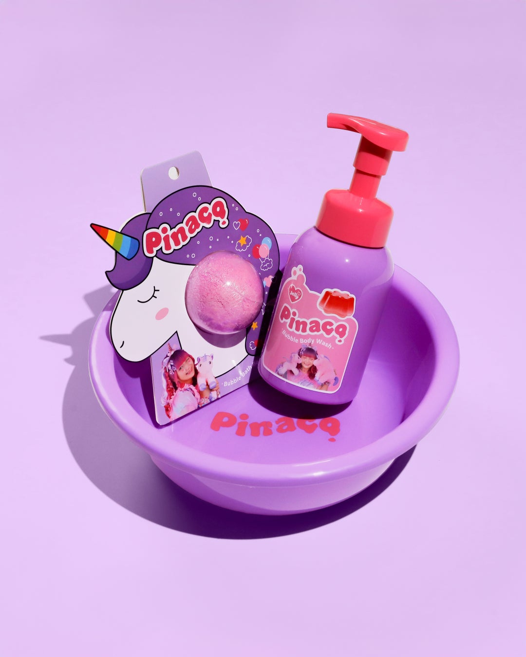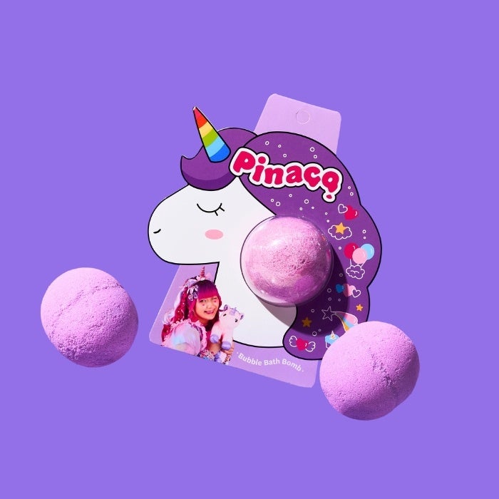 お湯に入れるとシュワシュワな炭酸が広がりユニコーンの涙のようなキラキラなラメが身体を包みま す。全身で楽しめるMagicキラキラバスボム!