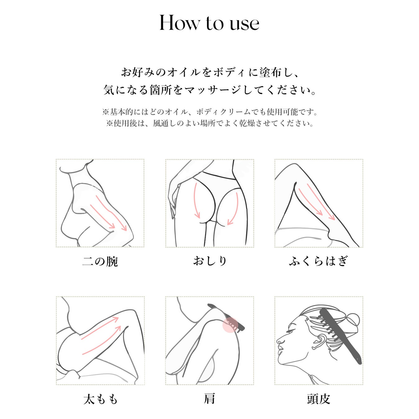 ボディに直接塗布し、カッサブラシで気になる箇所をマッサージしてください。